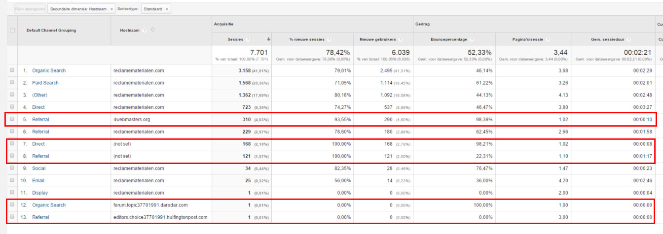 Als je bovenstaande twee stappen goed hebt doorlopen, zal je ongeveer dezelfde weergave zien als in bovenstaande afbeelding wordt weergeven. Sessies die verkregen zijn waar hostnamen bij staan, die niet relevant zijn aan jouw website, of waar (not set) bij staan, bestaan uit spamverkeer.