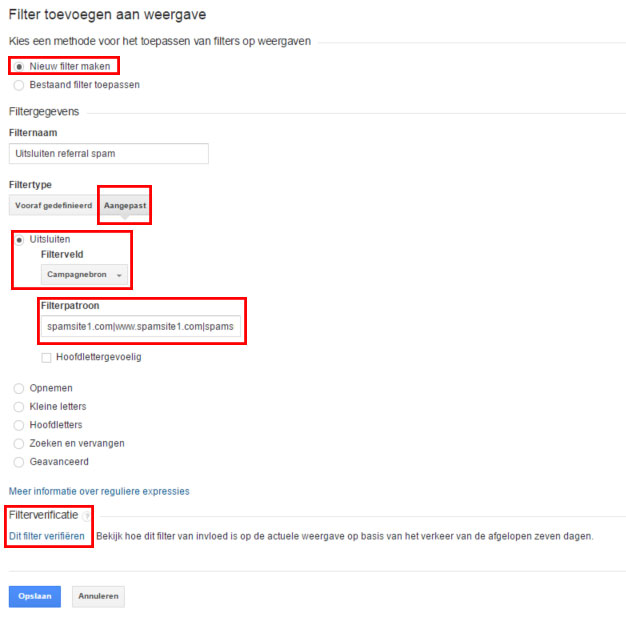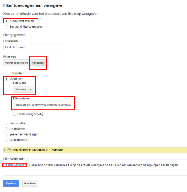 Controleer je filter altijd even door de filterverificatie. Wanneer hier wordt aangegeven dat er geen sessies worden uitgesloten, kun je het beste even alle stappen opnieuw doorlopen.