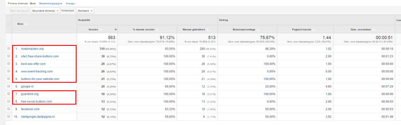 Met alleen het uitsluiten van direct verkeer spam zijn we er helaas nog niet. Het is ook van belang dat we referral spam gaan uitsluiten. Hieronder zie je een weergave van hoe referral spam eruit ziet in je Google Analytics-data. Deze weergave vind je op de volgende manier;