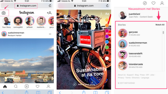 Zodra je naar instagram.com gaat, verschijnt linksboven het camera-icoon om Stories te delen via het mobiele web. De functionaliteit is beperkter dan de Stories in de app. Zo kun je foto’s nemen, kiezen uit foto’s in je camerabibliotheek en tekst toevoegen met een kleurtje.