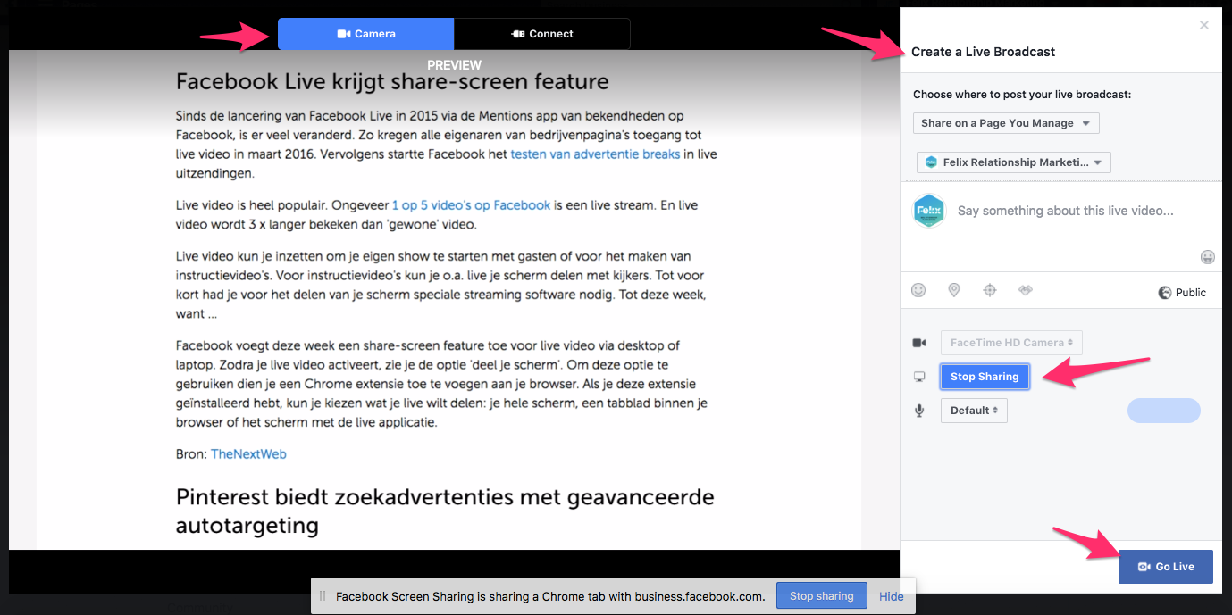 Tot deze week, want Facebook voegt deze week een screensharing-feature toe voor live video via desktop of laptop. Zodra je live video activeert, zie je de optie ‘deel je scherm’. Om deze optie te gebruiken dien je een Chrome extensie toe te voegen aan je browser. Als je deze extensie geïnstalleerd hebt, kun je kiezen wat je live wilt delen: je hele scherm, een tabblad binnen je browser of het scherm met de live applicatie.