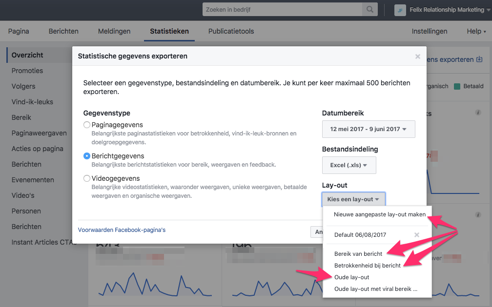 Af en toe voert Facebook een update door van Pagina-statistieken en deze week viel mijn oog op een update die ik via geen enkele officiële nieuwsbron heb teruggezien. Het is onbekend of deze update wereldwijd is doorgevoerd. Als je Statistieken nu opent en data exporteert, biedt Facebook je de keuze welke layout je wilt gebruiken voor je exportdata in Excel. Je kunt op postniveau kiezen uit het bereik van je bericht, betrokkenheid bij je bericht, een nieuwe aangepaste layout maken of de oude layout kiezen.