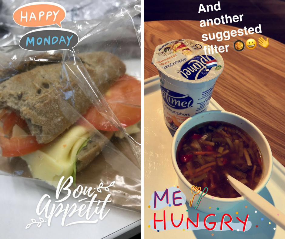 Een ander leuk nieuwtje zijn de slimme filters die suggesties doen zodra je iets gefotografeerd hebt met je Snapcamera. Snap herkent het object en doet suggesties voor een filter. Zo zijn er bijvoorbeeld nu filters die je bij je ontbijt of lunch kunt plaatsen (zie afbeelding hieronder).