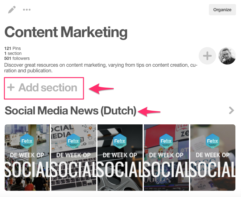Zodra je een bord opent, zie je bovenaan de optie ‘Voeg sectie toe’, waarmee je een subonderwerp kunt aangeven binnen je pinbord. Zodra je bordsectie een naam heeft, kun je pins direct toevoegen aan je bordsectie. De bordsecties groeperen bovenaan je pinbord en hebben elk een eigen unieke URL voor bijvoorbeeld doorverwijzing via het web.