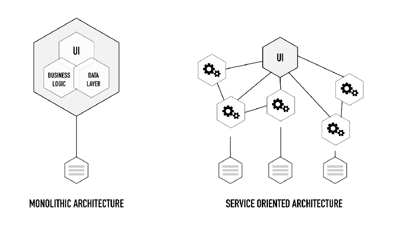 Bij een Service Oriented Architecture zijn de functioneel onderscheidbare services ook daadwerkelijke losse services, die niet verweven zijn met andere services of (nadelige) invloed kunnen ondervinden van andere services. Ze kunnen zelfs indien gewenst op zichzelf gehost worden, zijn grenzeloos schaalbaar, kunnen bergen met traffic aan, een developer kan eraan werken zonder van andere systemen kennis te hebben en ze zijn daardoor veel stabieler en veiliger. Nog makkelijker is dat ze ook heel makkelijk geupdate, uitgebreid of zelfs vervangen kunnen worden. Waar bij een monolithische architectuur de code eerst ontvlochten moet worden, kan bij een SOA de oude service gemakkelijk door de nieuwe worden vervangen: alleen het data-entry point, de API, moet opnieuw worden gekoppeld.