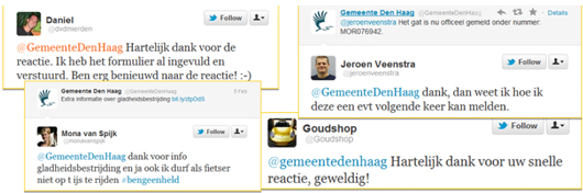 Om te kunnen communiceren als gelijkwaardige partner moet je zijn waar bewoners zich bevinden. Naast de telefoon, de balie en denhaag.nl kunnen Hagenaars ook contact zoeken via sociale media kanalen. Vooral via Twitter worden de inspanning van de gemeente Den Haag positief ontvangen. Hieronder duidelijk zichtbaar in de voorbeelden naar het Gemeente Den Haag account.