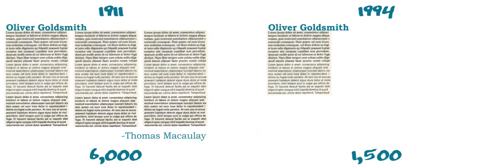 Hij laat een artikel over de schrijver Oliver Goldsmith uit de Encyclopedia Britannica zien. Het artikel was in 1911 zo’n 6.000 woorden lang. In de editie van 1961 was het artikel gehalveerd naar 3.000 woorden. En de editie van 1994 halveerde de tekst nogmaals naar zo’n 1.500 woorden.