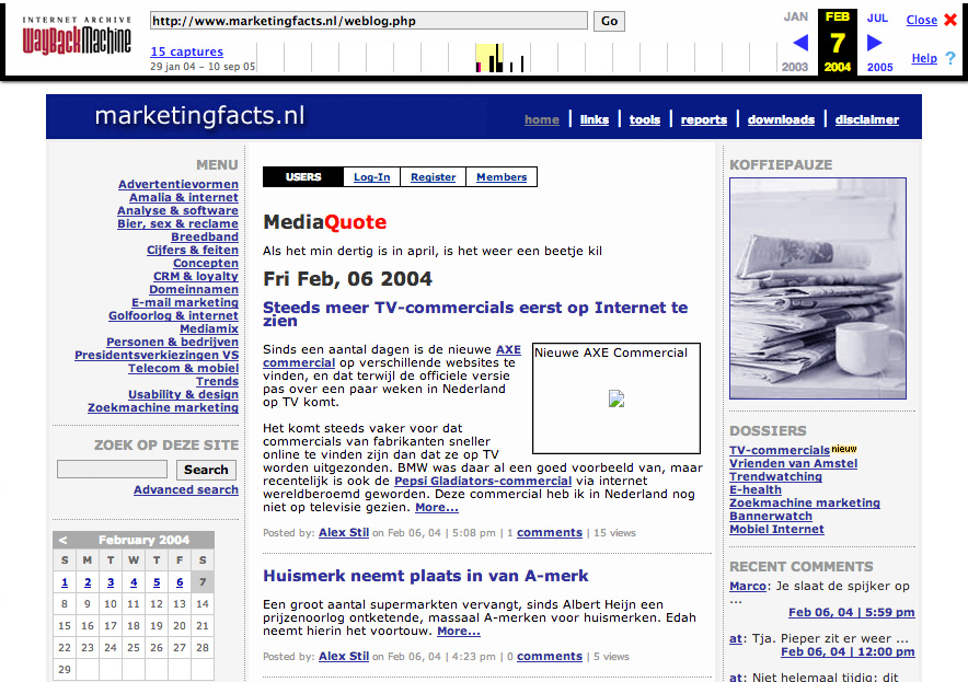 Brewster Kahle van de Internet Archive (bij veel mensen bekent van de Wayback Machine) verzorgde de eerste keynote. The Internet Archive is al zo’n 20 jaar bezig met het vastleggen en beschikbaar maken van het internet. Een voorbeeld: zo zag Marketingfacts er in februari 2004 uit, en via de navigatie bovenaan zijn versies van honderden andere data te bekijken. Inmiddels worden miljarden pagina’s door de Internet Archive elke twee maanden vastgelegd en beschikbaar gesteld.