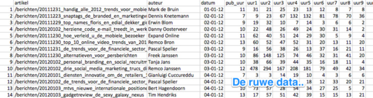 Uit het contentmanagementsysteem van Marketingfacts hebben we een lijst met alle gepubliceerde artikelen over heel 2012 gekregen. Voor elk artikel hebben we de URL, datum, tijdstip en wat meta-informatie zoals auteur, categorieën, etc.