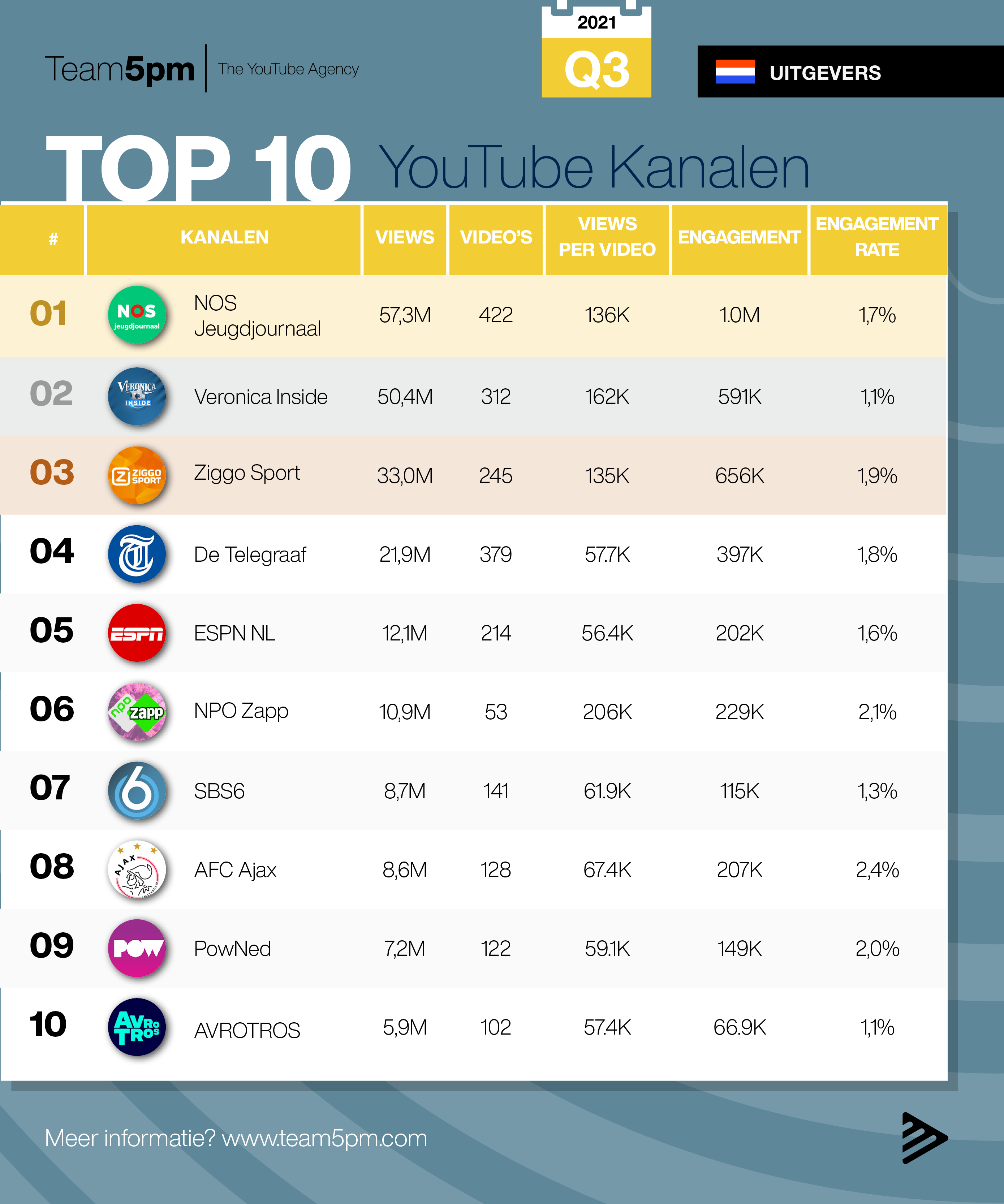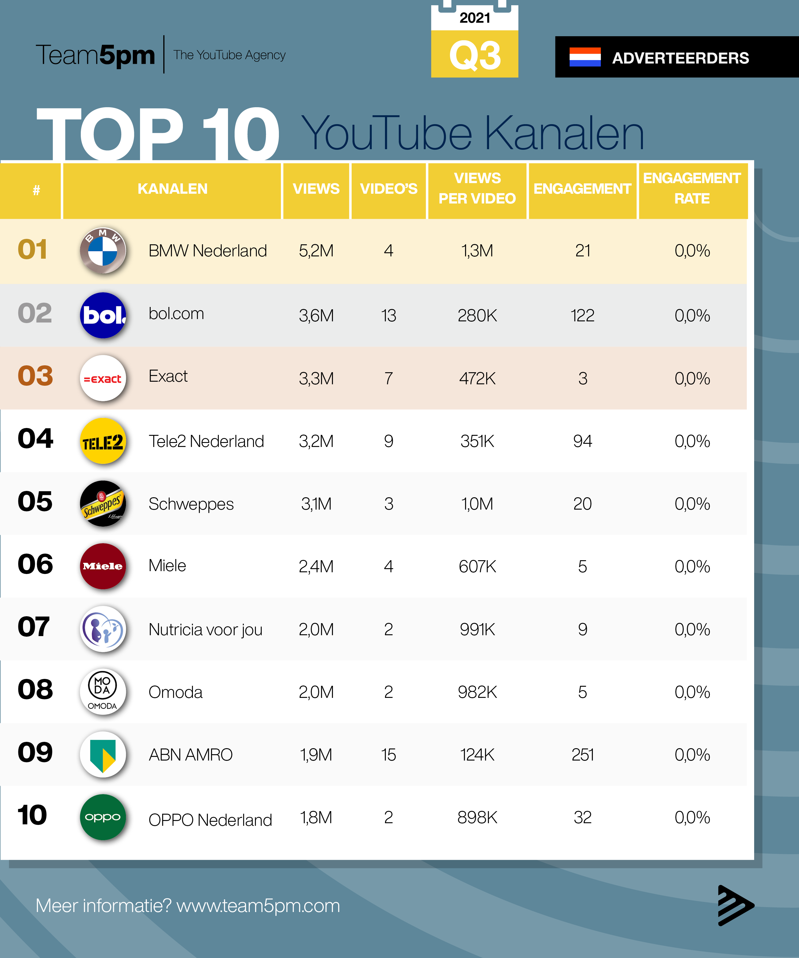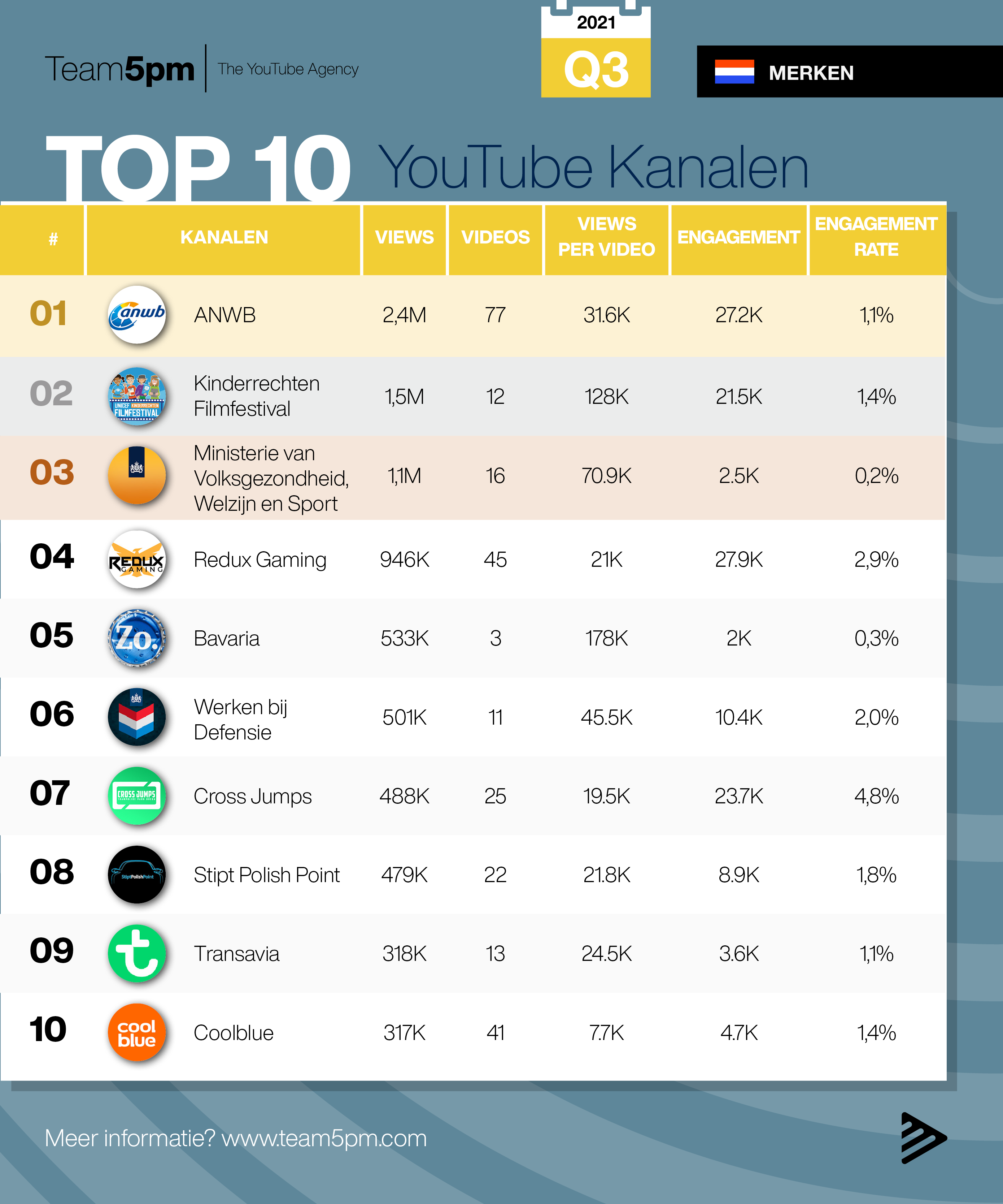 De strijd om views gaat door, ook in Q3 van 2021 blijven kanalen op YouTube massaal content uploaden om zo hun kijkers te blijven boeien. Hoe presteerden de merken, uitgevers en adverteerders in deze afgelopen maanden? Welke content behaalde de meeste views? Op basis van het aantal views van de video’s die zijn geüpload in de afgelopen maanden, zet Team5pm de populairste merken, uitgevers en adverteerders op YouTube op een rij.