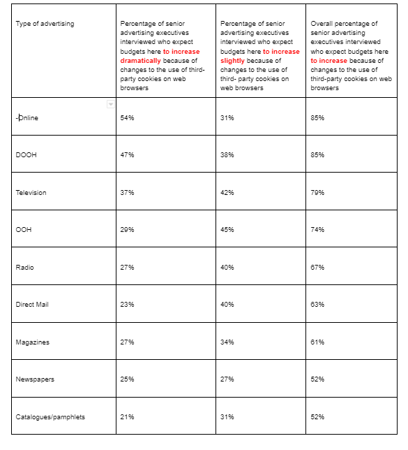Alfi, een SaaS-advertentieplatform, gaf opdracht aan PureProfile om senior managers in de VS, het VK, Canada, China, Frankrijk, Duitsland en de VAE te bevragen naar verwachte budgetverschuivingen door de third party cookie uitfasering. 85% van deze senior managers verwacht een toename in DOOH en online reclame.