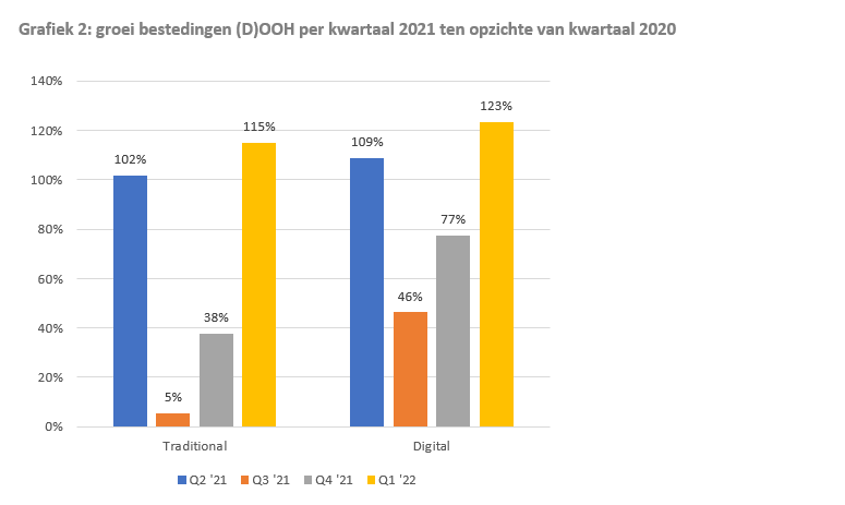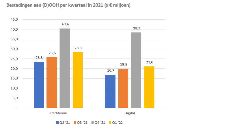 De bestedingen aan Out Of Home (OOH) reclame zijn in het eerste kwartaal van 2022 ruimschoots verdubbeld ten opzichte van dezelfde periode in 2021 en kwamen uit op € 49,3 miljoen (€22,6 miljoen in Q1 2021). De grootste groei kwam in dit kwartaal voor rekening van Digital Out of Home.