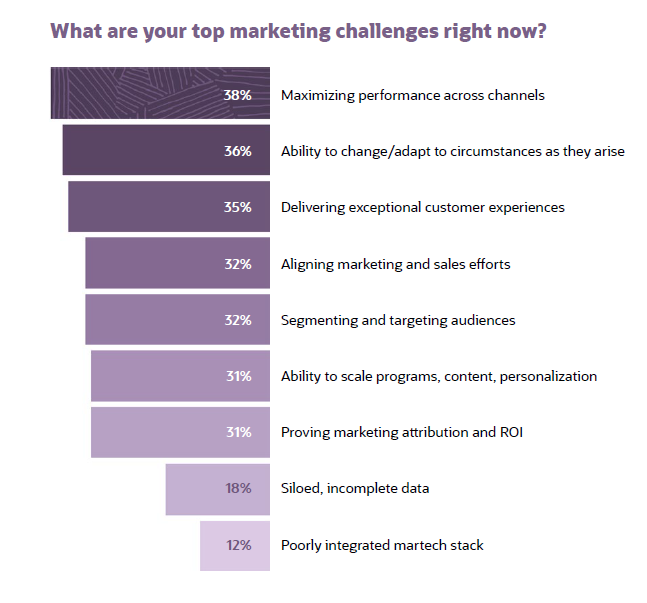 Als marketeer staan er tegenwoordig nogal wat kanalen “open” om consumenten mee te beinvloeden. Het publiek is overal, op verschillende kanalen en platformen. “Overal tegelijk zijn en op een consistente en relevante manier boven komen drijven, kan net zo moeilijk zijn als het klinkt”, schrijven de onderzeokers. 38% van de ondervraagde marketeers ziet het maximaliseren van kanaalprestaties een van hun belangrijkste marketinguitdagingen.