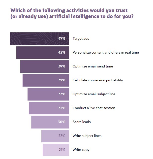 Marketeers in alle segmenten gebruiken AI om marketingtaken uit te voeren. Bijna de helft (47%) van de ondervraagden geeft aan dat ze AI zouden inzetten voor het targetten van advertenties. Andere topactiviteiten die ze zouden “overdragen” aan AI, zijn onder meer realtime personalisatie en de optimalisatie van bijvoorbeeld de verzendtijden van e-mail.