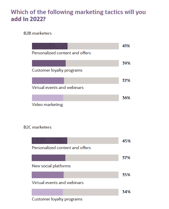 Welke marketing tactieken (webinars, video marketing, social platforms) gaan marketeers in 2022 toevoegen, en dan b2b afgezet tegen b2c?
