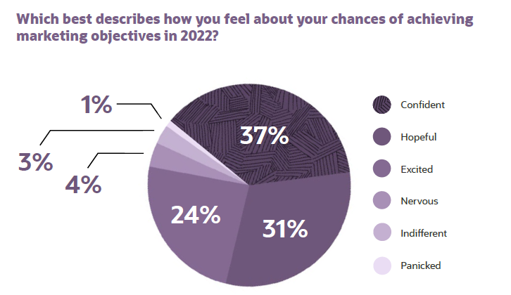 Uit het onderzoek blijkt dat 94% van de marketinginspanningen van marketeers in 2021 succesvol was, naar eigen zeggen dus, maar daar baseren we ons op. “Met 2021 in de achteruitkijkspiegel zijn marketeers klaar om 2022 te omarmen,” meldt het rapport. Uit het onderzoek blijkt dat de vooruitzichten van marketeers voor 2022 positief waren: 37% heeft vertrouwen, nog eens 31% is hoopvol en 24% is enthousiast.