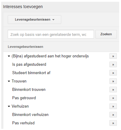 Een andere interessante optie is het targeten op belangrijke levensgebeurtenissen. Dit kan op zowel YouTube als in Gmail. Stel: je bent eigenaar van een bruidsmodezaak. Dan is het heel interessant om te targeten op potentiële consumenten die gaan trouwen. Je kunt natuurlijk ook targeten op mensen die onlangs getrouwd zijn, gaan verhuizen, onlangs verhuisd zijn, gaan afstuderen of pas net afgestudeerd zijn.