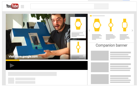 Bij Skippable TrueView-video’s betaal je zodra er interactie is met je video, of wanneer een kijker 30 seconden of langer je video bekijkt. Je kunt maximaal zes producten weergeven naast de video. Die zijn bovendien swipeable. Bovenstaande afbeelding is één van de drie type weergaven in TrueView Shopping-campagnes.