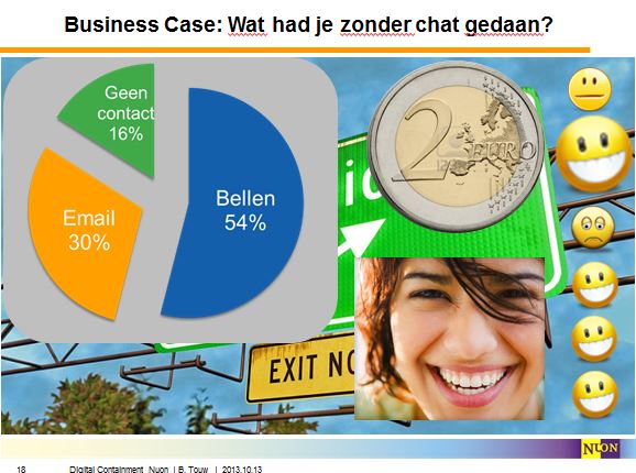 Uit businesscase-berekeningen blijkt dat de kosten voor servicechat en telefonie vergelijkbaar zijn. Servicechat is dus niet zozeer goedkoper dan telefonie. Wél zijn klanten meer tevreden en liggen de conversiepercentages beduidend hoger dan aan de telefoon: vooral proactief benaderde klanten worden makkelijker over de streep getrokken in een transactieproces. Maar als gezegd: service is bij Nuon het primaire doel. Servicechat in vergelijking met e-mail is duidelijk een positieve businesscase.