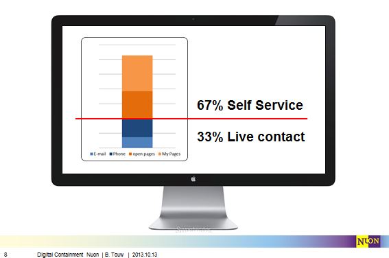 In de Nuon-visie op klantcontact staat centraal dat de klant zelf bepaalt via welke manier hij contact opneemt. Dat kan via allerlei kanalen, van telefoon en e-mail tot social media en chat. Toch verwacht het energiebedrijf dat in 2018 het overgrote deel van de klantinteractie digitaal verloopt, met selfservice als belangrijk fundament. Volgens Bas Touw ligt in de consumentenmarkt het aandeel selfservice nu al op 67 procent en is de groei er nog niet uit: “Klanten omarmen de mogelijkheden om zelfstandig actie te ondernemen. De primaire reden daarvoor is de geringe moeite die klanten moeten doen om iets online te regelen.”