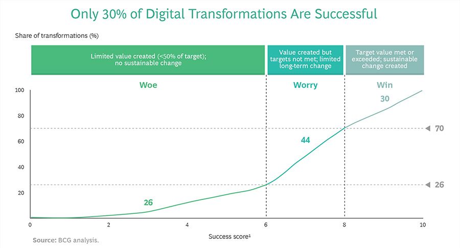 Bijzonder onderzoek dat vorige week door Boston Consulting Group werd gepubliceerd en dat werd opgepikt door Marketingfacts-oprichter Marco Derksen, die zich in de afgelopen jaren ook bijzonder heeft toegelegd op (geslaagde) transformaties: van alle onderzochte DT-projecten kon volgens BCG eigenlijk maar 30 procent als echt ‘geslaagd’ worden aangemerkt.