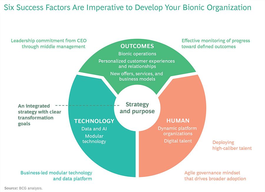 Een digitale transformatie kan aanzienlijke onzekerheid veroorzaken in de lagere rangen van een bedrijf omdat elke fundamentele verandering in de richting van automatisering banen in gevaar brengt. BCG stelt zich een ‘bionische’ organisatie voor – waar mensen en technologie samenwerken om resultaten te behalen. Komt gelijk de derde succesfactor om de hoek: inzetten van hoog gekwalificeerd talent.