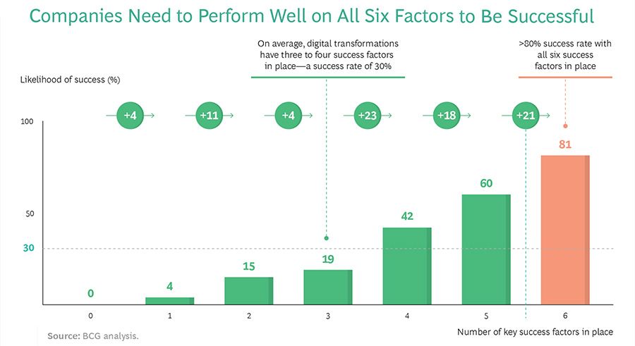 BCG noemt dat een uitvalpercentage van 70 procent volgens elke norm zorgwekkend, juist nu de economie redelijk in de touwen hangt als gevolg van de pandemie. Je hebt dat succes nodig. Volgens de groep hangt succes in digitale transformaties samen met zes factoren, die mits opgevolgd de kans op slagen aanzienlijk zou vergroten. Opvallend genoeg hangt er daarvan maar ééntje samen met de techniek zélf.