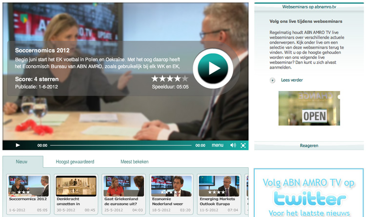 Deze player is geheel is de huisstijl van ABN AMRO, met volledige grip op sharing en gerelateerde video’s.