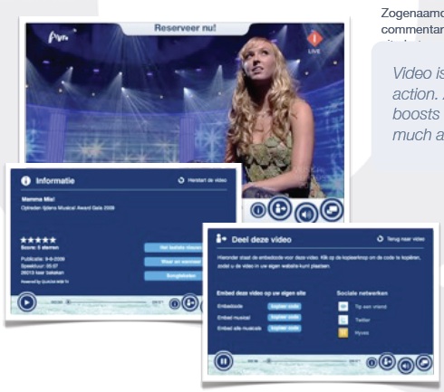 Ook de gebruikte player is een wezenlijk onderdeel van uw content. Niet alleen voor branding, maar ook omdat deze player de interactieve componenten bevat die bijvoorbeeld delen en conversie eenvoudig maken. De video is de aanleiding voor de kijker om tijd te besteden aan uw merk, de player dient de volgende stap mogelijk te maken. De player is dus eigenlijk een kleine website met diverse manieren om een relatie met de kijker te starten. Des te mooier als uw content met player wordt verspreid. Het gebruik van uw eigen player zorgt er ook voor dat u de touwtjes zelf in handen houdt. Zo kunt u video's terugtrekken en kunt u alle locaties eenvoudig voorzien van een nieuwe video.