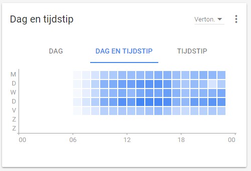 - Dag en tijdstip: deze widget laat je zien op welke dagen en tijdstippen jouw advertenties de beste prestaties hebben behaald. Eigenschappen waarop je dit overzicht kunt afstemmen zijn: aantal klikken, vertoningen, CTR, gemiddelde CPC, kosten, conversies, kosten/conversie, conversiepercentage, totale conversiewaarde, conversie-waarde/kosten, vertoningenpercentage voor zoeken en gemiddelde positie. Genoeg mogelijkheden om gedegen overwegingen te maken voor jouw advertentieplanning dus.