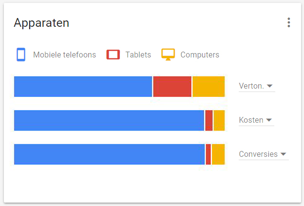 - Apparaten: om snel en duidelijk overzichtelijk te maken hoe jouw advertenties presteren op de verschillende apparaten die we vandaag de dag kennen, heeft Google de widget ‘Apparaten’ opgenomen in de nieuwe interface. Het opnemen van dit inzicht in het dashboard maakt je als marketeer waarschijnlijk nóg bewuster van het belang van mobiel.