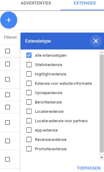 - Een andere kleine, maar zeer handige, wijziging is dat het onder de subtab ‘Extensies’ mogelijk is alle actieve extensies in je account/campagne in één overzicht zichtbaar te maken door de optie ‘Alle extensietypen’ te selecteren. Zo zie je dus in één oogopslag welke advertentie-extensies je momenteel inzet en welke er wellicht nog ontbreken. Zonder dat je je hiervoor een weg door alle mogelijke extensies hoeft te klikken.