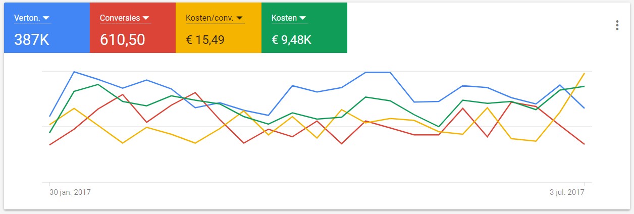 - Verder maakt deze nieuwe interface het mogelijk om de grafiek boven aan de pagina te laden met meer dan slechts 2 lijnen. Waar er in de oude interface maximaal 2 lijnen ingeschoten konden worden, is het nu mogelijk om 4 verschillende variabelen in te laden. Zo kun je nu dus bijvoorbeeld ‘Vertoningen’, ‘Conversies’, Kosten/conversie, en ‘Kosten’ allemaal in één grafisch overzicht weergeven, allen aangeduid met een eigen duidelijke kleur.