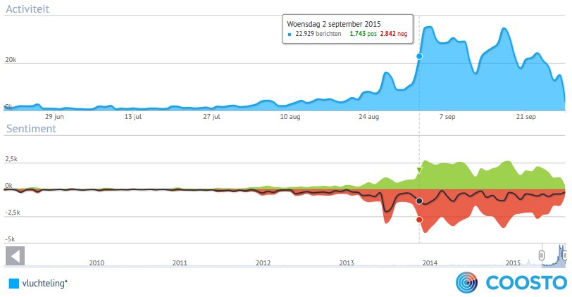 De vluchtelingenproblematiek werd uiteraard ook op sociale media uitgebreid besproken. Dat de meningen sterk uiteenlopen, is duidelijk te zien in onderstaande grafiek. Ook dat 2 september, de dag van dé foto, het startschot was voor het echte debat.