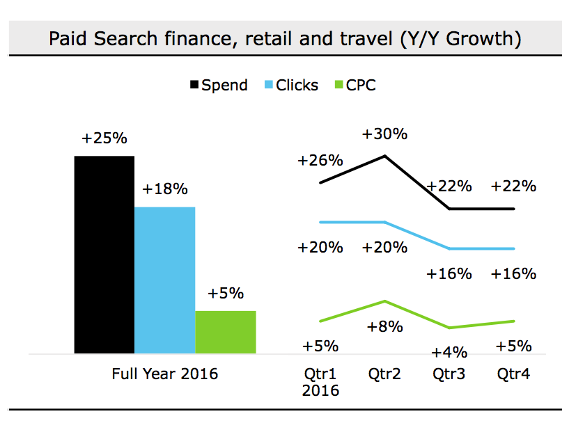 Die budgetgroei van 25 procent komt vooral door de stijging van mobiele zoekopdrachten via Google en desktopzoekopdrachten via Bing. Als gevolg van de relatief lagere kosten per klik (CPC) van mobiele advertenties en Bing’s algehele CPC, zijn de tarieven voor zoekmachinemarketing licht toegenomen (5 procent). Die groei komt vooral door de stijging in uitgaven van de retail- (36 procent) en travelindustrie (25 procent.)
