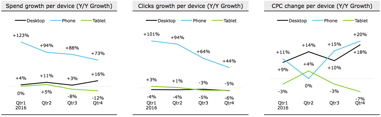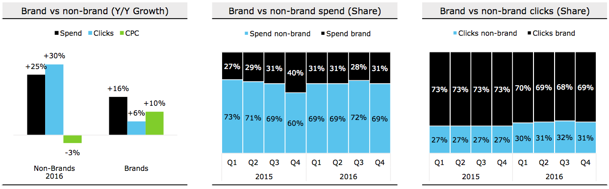 Adverteerders geven in 2016 ook meer geld uit aan non-branded keyword clicks. Door de groei van het aantal clicks bij non-branded keywords ten opzichte van branded keywords is de CPC voor merknamen met 10 procent gestegen en die voor niet-merknamen met 3 procent gedaald.