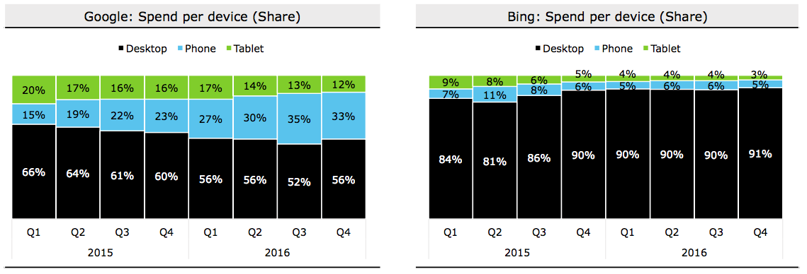In het laatste kwartaal van 2016 hebben adverteerders 33 procent van hun Google searchbudget op mobiele advertenties ingezet. Dit in tegenstelling tot Bing, waar maar 8 procent van het searchbudget mobiel is gespendeerd.
