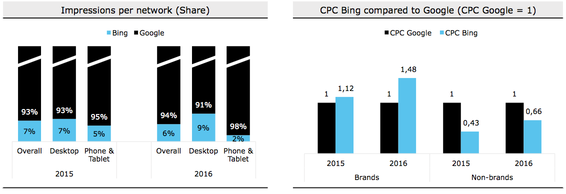 Google domineert, zowel op smartphones als tablets, de metric omtrent impressies met 98 procent. Ondertussen wint Bing een klein beetje terrein qua impressies op desktop: 9 procent in 2016 tegenover 7 procent in 2015.