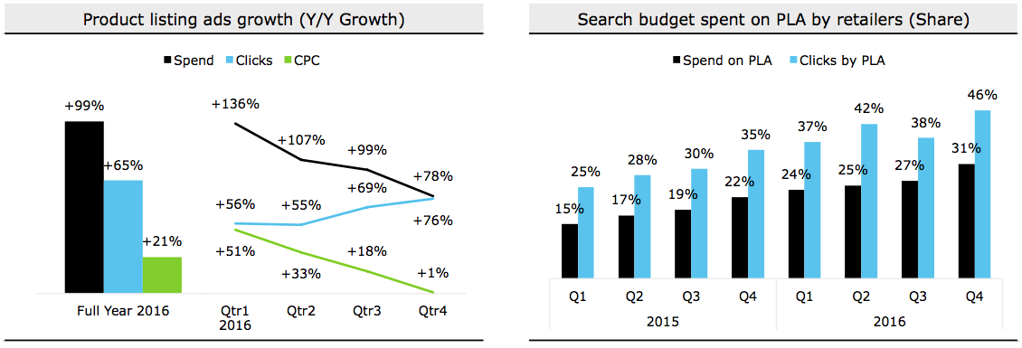 Product Listing Ads (PLA’s) zijn populair. Zo populair zelfs dat over heel 2016 de besteding van adverteerders op PLA’s met 99 is procent gestegen. Belangrijke kanttekening is dat PLA’s momenteel alleen kunnen worden gebruikt in de retailsector. Die sector geeft ook gelijk meer dan 31 procent van het searchbudget aan deze vorm van zoekmachinemarketing uit. Het gevolg hiervan dat 46 procent van alle traffic via deze vorm van online adverteren wordt gegenereerd.