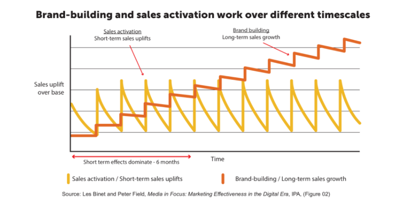 Het is dan ook heel logisch om de 60-40% Branding regel te hanteren, dat je dus 60% aan Branding besteed en 40% aan Performance marketing. Dat is gewoon een lesje Binet& Field, uitgebreid besproken hier op Marketingfacts (en puik uitgelegd) door Rob Revet: The Long and the Short: Hoe werkt dat nou?