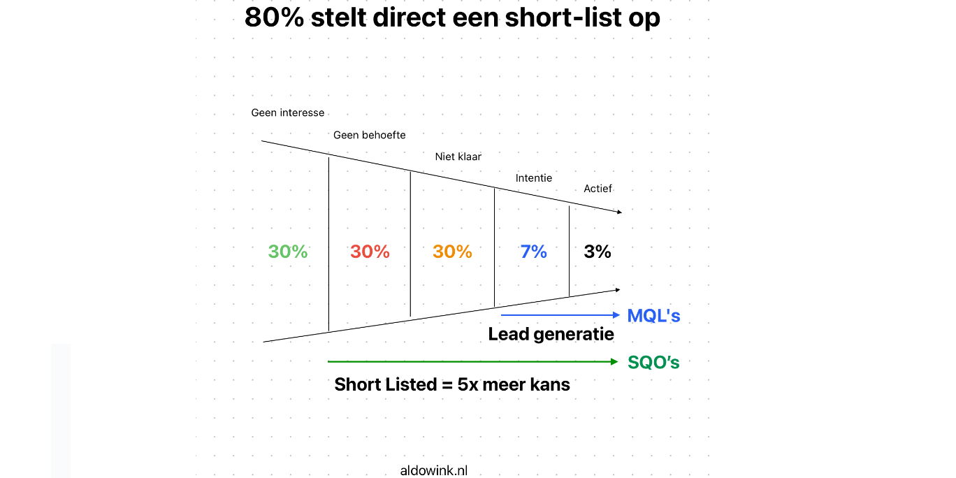 De meeste bedrijven hebben marketing campagnes draaien gericht op actieve kopers. En daarmee denken ze slim te zijn. Maar ze zien iets heel belangrijks over het hoofd en dat is dat maar 3% van hun markt is een actieve koper. 97% is dus passief. Maar nu komt het: liefst 80% van alle bedrijven hebben al een short-list opgesteld nog voordat ze hun aankoopreis opstarten.