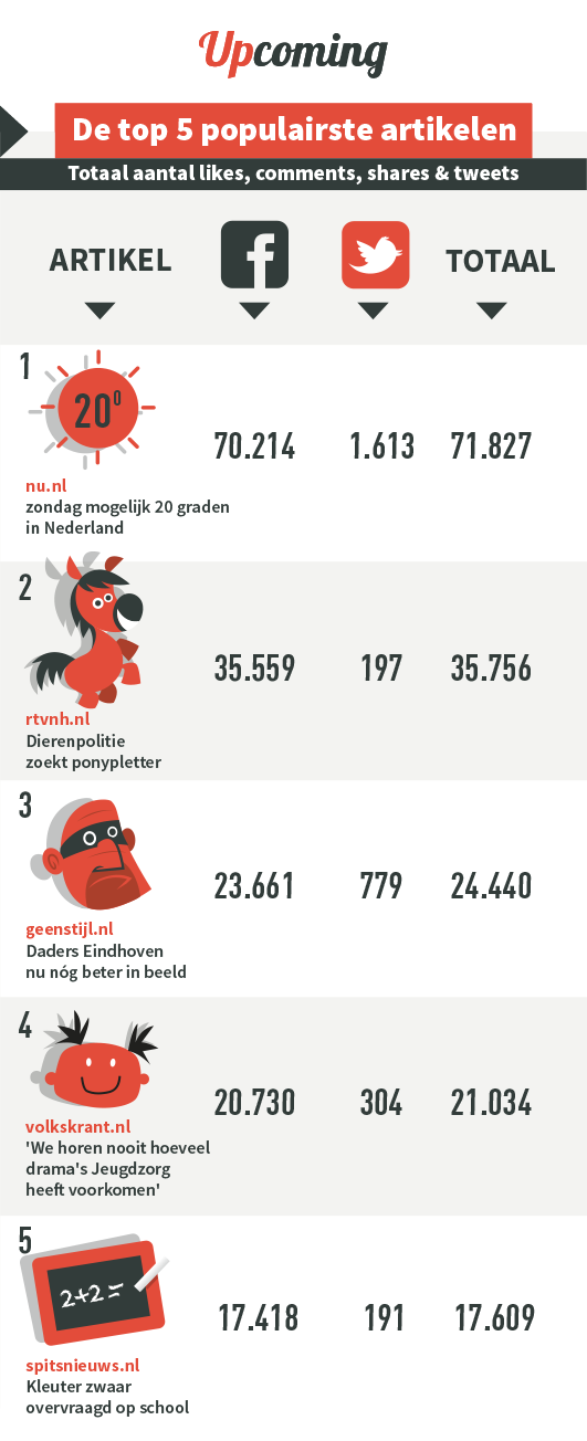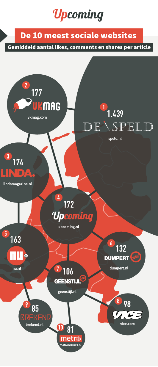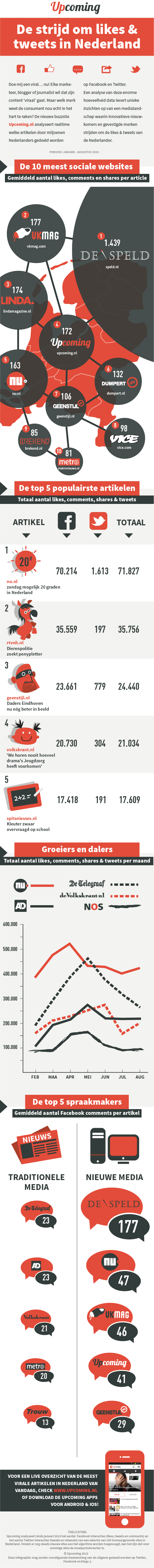 Iedere blogger, journalist en nieuwssite wil dat zijn content ‘viraal’ gaat en massaal gedeeld wordt op sociale media. Maar welke uitgevers weten de consument nu echt in het hart te raken? De nieuwe ‘buzzsite’ Upcoming.nl analyseert sinds begin dit jaar realtime welke artikelen door miljoenen Nederlanders gedeeld worden op Facebook en Twitter. Een analyse van deze enorme hoeveelheid data levert unieke inzichten op van een medialandschap waarin innovatieve nieuwkomers en gevestigde merken strijden om de likes & tweets van de Nederlander. Zo leren we bijvoorbeeld dat de artikelen van satirische nieuwssite De Speld verreweg het meest gedeeld worden, dat NU.nl in totaal de meeste sociale shares genereert en dat uitgevers veel winst kunnen behalen met sociale optimalisatie van hun sites.