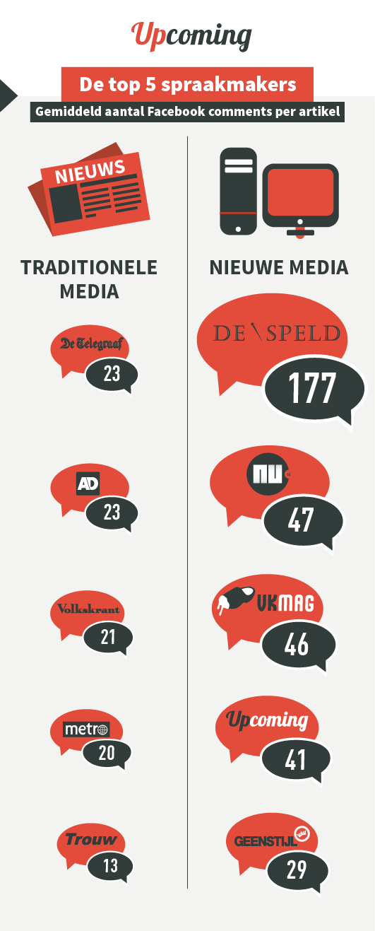 Als je een vergelijking maakt tussen de ‘traditionele’ nieuwsmedia en de ‘nieuwe’ mediatitels, is het interessant om te zien dat een gemiddeld artikel van de ‘nieuwe media’ aanzienlijk meer discussie op social media losmaakt dan de traditionele media. Een verklaring is wellicht dat mensen eerder geneigd zijn om de wat lichtere content van sites zoals De Speld, VKmag en Upcoming te delen en bespreken op social media. Daarnaast speelt ook hier de kwantiteit van artikelen een rol: zodra je alle comments gaat optellen zijn de verhoudingen overigens andersom en staan de traditionele medianamen bovenaan. Deze data zeggen dan ook meer over welk type content het goed doet op social media, dan over welke sites het grootste bereik hebben op social media.
