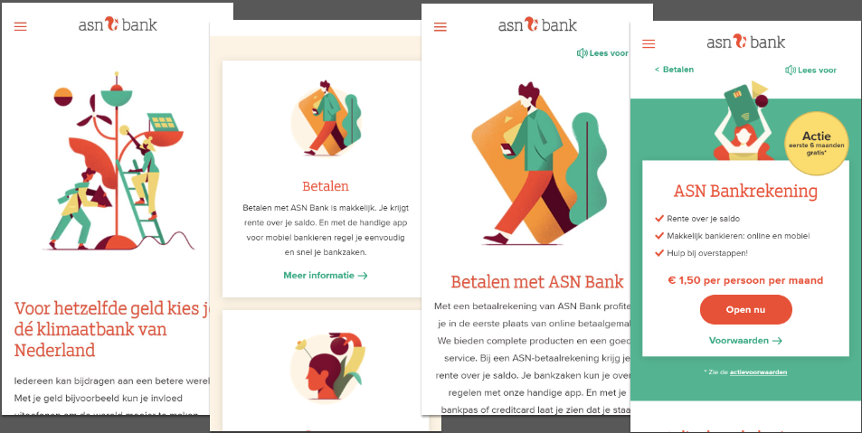 Een verbluffend resultaat zien we bij ASNBank.nl: ze slepen de winst binnen op smartphone en stijgen maar liefst twintig plekken ten opzichte van vorig jaar. De klant vindt de website rustig, simpel en overzichtelijk: in twee stappen ben je bij het openen van een rekening. Ook ziet de website er mooi uit, verwachten de klanten een passend product te vinden en komt het bedrijf sympathiek over. Dit komt door het heldere taalgebruik en de iconen die overal doorgevoerd worden.