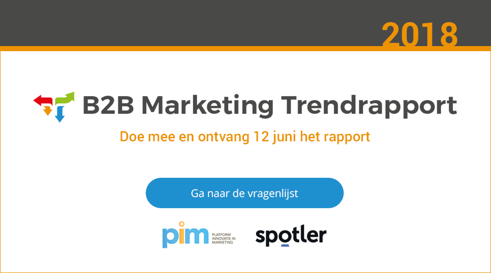 Het Platform Innovatie in Marketing (PIM) en Spotler brengen de belangrijkste trends in B2B marketing in kaart. Daarbij hebben we jouw hulp nodig. Geef je input vóór 16 maart en ontvang op 12 juni gratis het B2B Marketing Trendrapport 2018 in je inbox!