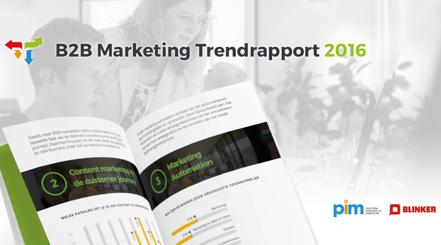 Het Platform Innovatie in Marketing (PIM) en Blinker brengen de belangrijkste trends in B2B marketing in kaart. Daarbij hebben we jou nodig. Geef je input vóór 22 april en ontvang eind mei gratis het B2B Marketing Trendrapport 2016 in je inbox. Help je mee?