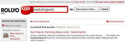 Je eigen zoekmachine, hoe handig! Ga naar rollyo.com, maak je profiel aan, kies de websites die je wil doorzoeken en klaar. Bekijk bijvoorbeeld eens de Marketingfacts Rollyo, misschien zelfs beter dan de huidige zoekfunctie.