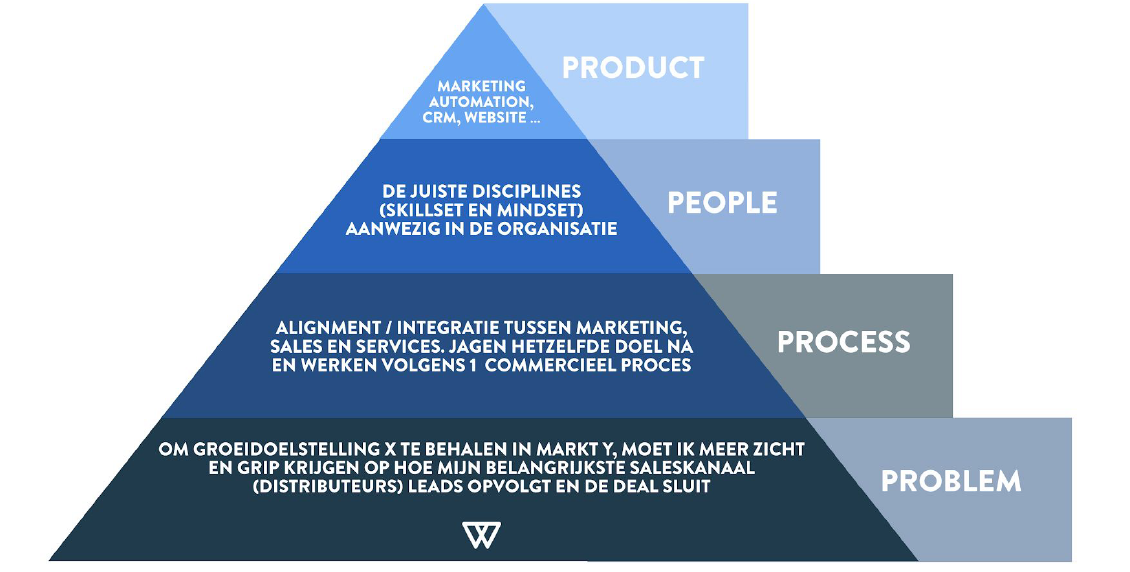 Juist, we beginnen onderaan de piramide. Een probleem is altijd te herleiden naar harde euro’s, maar gaat veel verder dan een salestarget in de vorm van X nieuwe klanten. Ik neem in dit voorbeeld aan dat je meer grip wil krijgen op je distributeurs om in specifieke markten meer new business te genereren. Distributeurs kennen de markt goed en kunnen voor je klanten als lokale en betrouwbare partner fungeren. Wat blijkt? Verschillende distributeurs zijn niet tevreden met de kwaliteit van leads die je marketingteam vanuit het hoofdkantoor aanlevert. Bovendien is het maar de vraag of de leads überhaupt worden opgevolgd. Je kunt niet voorspellen wanneer een deal gaat vallen en of je op koers ligt met je salestargets.