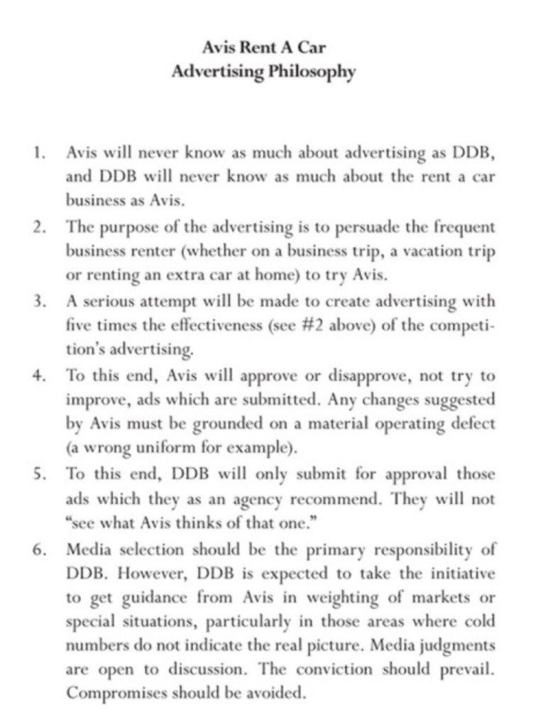 Dit moet uit een ver verleden zijn. Het lettertype doet dat ook vermoeden. De advertentiefilosofie van Avis. Ik heb nog getracht om de herkomst te vinden maar dat is (nog) niet gelukt. De eenvoud en de duiding van deze 6 punten zijn wel zeer helder en misschien zelfs vandaag de dag zeer toepasbaar. Het gaat uit van het idee dat ieder zijn specialistische kennis heeft en die ook moet gebruiken. Dus we gaan bij het beoordelen van het creatieve werk niet samen co-creëren maar het beoordelen op feitelijkheid. En daarbij gaan we uit van de kennis van het bureau als het gaat om de effectiviteit van de creativiteit. Klinkt heel nostalgisch en ook wel heel erg lief. En wie weet, misschien zelfs wel heel effectief.