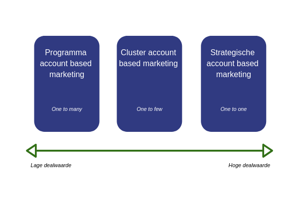 Hoe kom je er achter welke vorm van account-based marketing bij jouw organisatie past? Dat hangt af van een aantal belangrijke parameters zoals het type organisatie waarbij je werkt en de markt waarin deze actief is. De gemene deler om een idee te krijgen welke vorm het beste bij jouw organisatie past is de gemiddelde (deal) waarde van een klant. Uitgaande dat een hogere dealwaarde correleert met de mate van complexiteit van het product.